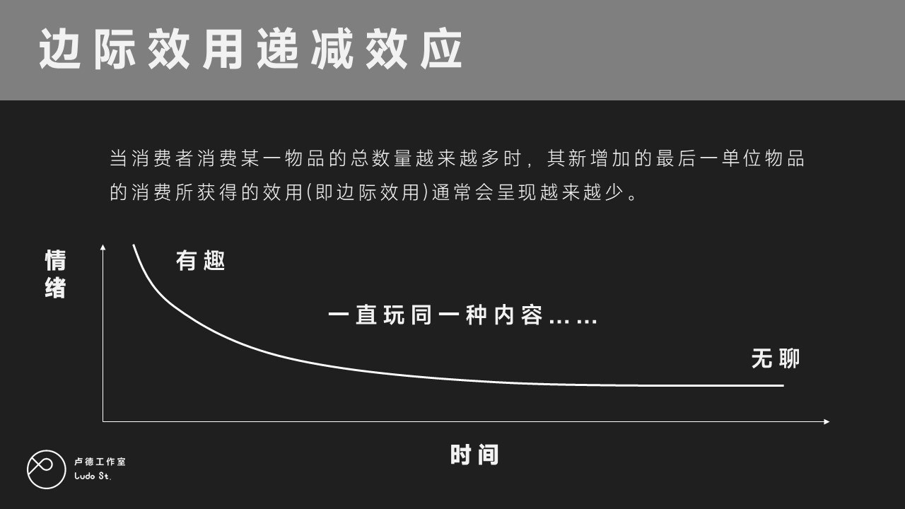 玩家有这样的体验其实是和我们人的内心对于一个事物的理解有关,它与微观经济学里面的边际效应类似。 边际效用递减就是当你消费一个东西的时候,你随着你的消费次数增多,你对它的体验会逐渐降低,好比我今天吃到了一碗面,我觉得这个面很好吃很香,然后明天继续吃,后天继续吃,每天都吃,那么总有一天我会吃腻。