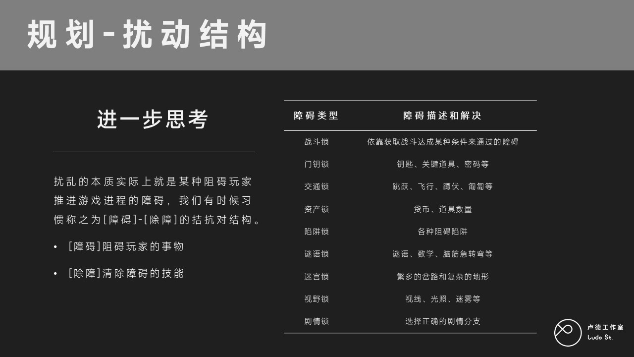 我在上面途中也总结了一些大家可能遇到的障碍类型。一般谜题设计里面特别喜欢将一个概念叫做锁钥结构,通过不同类型的锁控制玩家前进线路,让玩家自行想办法打开门。关于锁钥结构,又是另一个话题了。